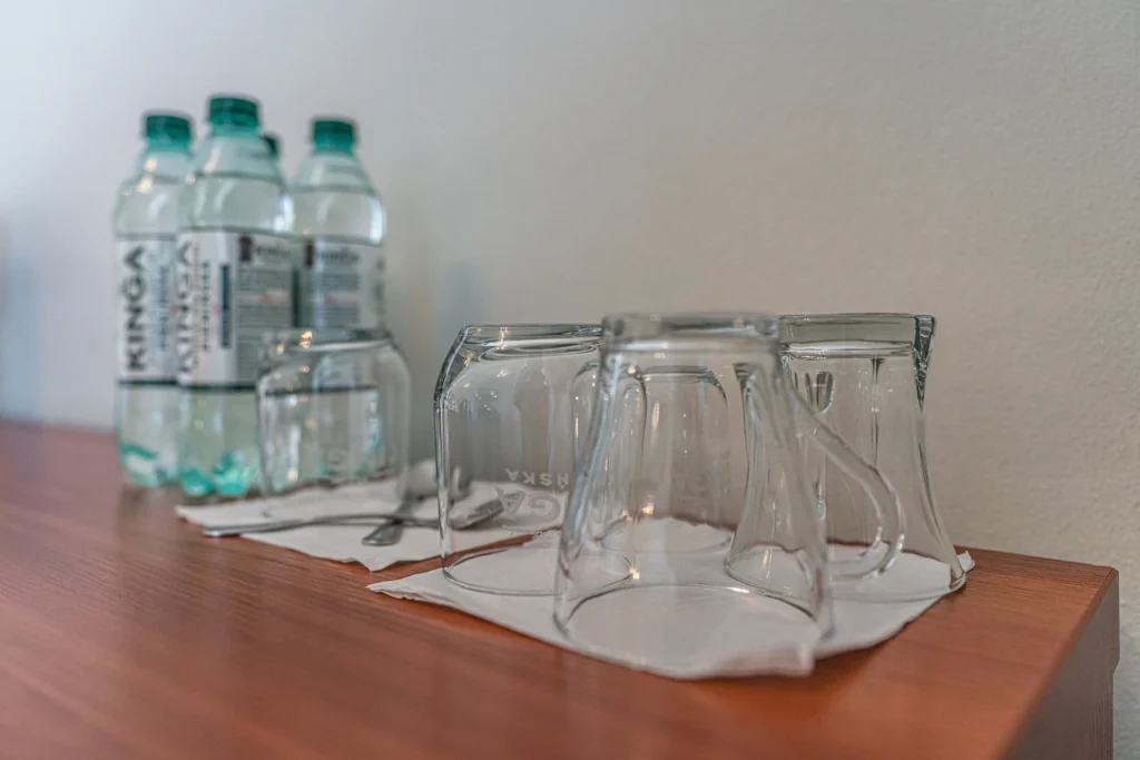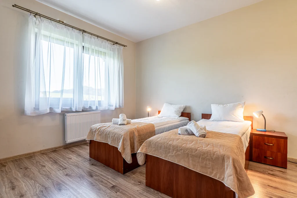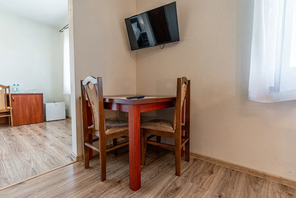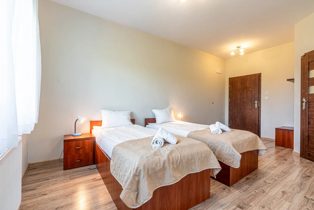 Przestronny 4-osobowy pokój, z pełnym wyposażeniem. Znajdziesz w nim: 2 wygodne łóżka pojedyncze, 1 łóżko małżeńskie, stół z krzesłami, TV, lodówkę, czajnik i szklanki. W łazience prysznic, suszarka do włosów oraz ręczniki. Dodatkowo w obiekcie udostępniamy: internet Wi-Fi,  deskę do prasowania i żelazko.